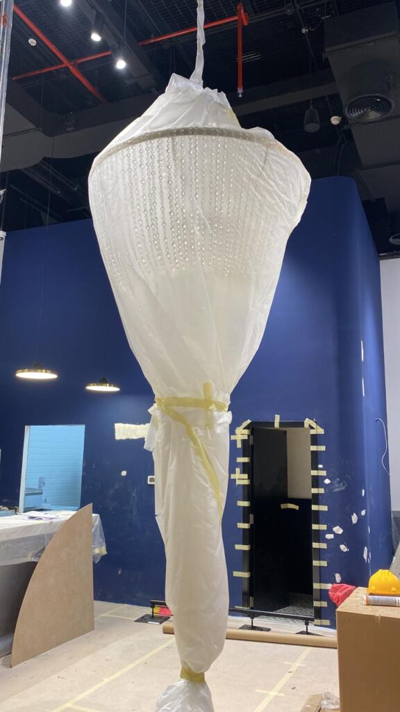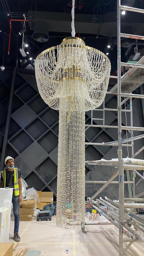 The chandelier’s elongated vertical form, extending gracefully downward, emphasizes height and presence, making it especially suited for double-height spaces, lobbies, and grand entrances. Each strand of crystals is meticulously arranged, ensuring a balanced symmetry that enhances the chandelier’s architectural beauty.