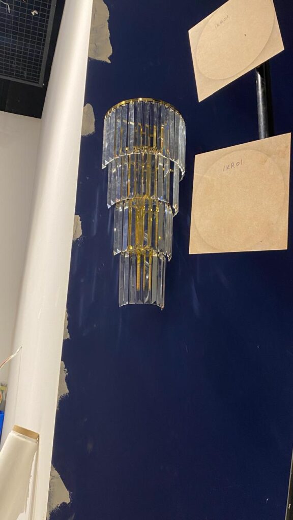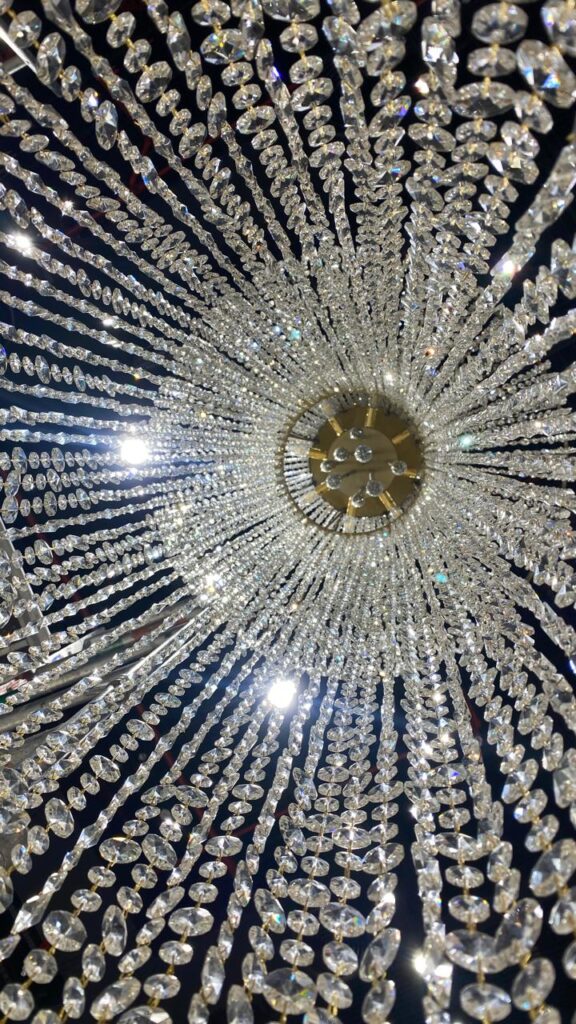 This magnificent crystal chandelier is a statement piece of refined elegance and grandeur, designed to transform its surrounding space into a scene of luxury. The chandelier features a tiered structure with cascading strands of high-quality crystals that shimmer with brilliance under light, creating a mesmerizing play of reflections and sparkle. Its golden frame provides a regal contrast to the delicate transparency of the crystals, adding warmth and sophistication to the overall design.